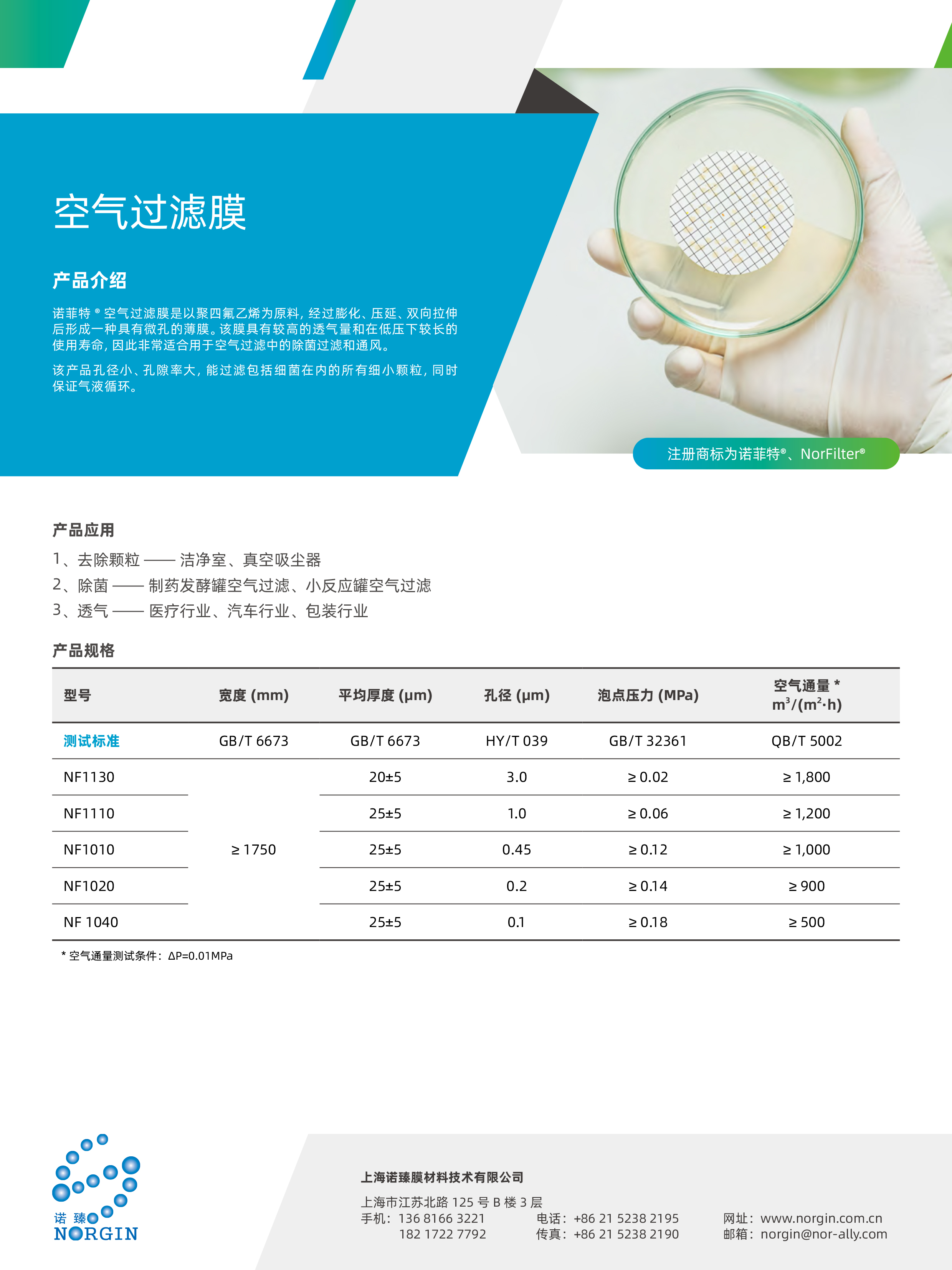 诺菲特®空气过滤膜是以聚四氟乙烯为原料,经过膨化、压延、双向拉伸后形成一种具有微孔的薄膜。该膜具有较高的透气量和在低压下较长的使用寿命,因此非常适合用于空气过滤中的除菌过滤和通风。